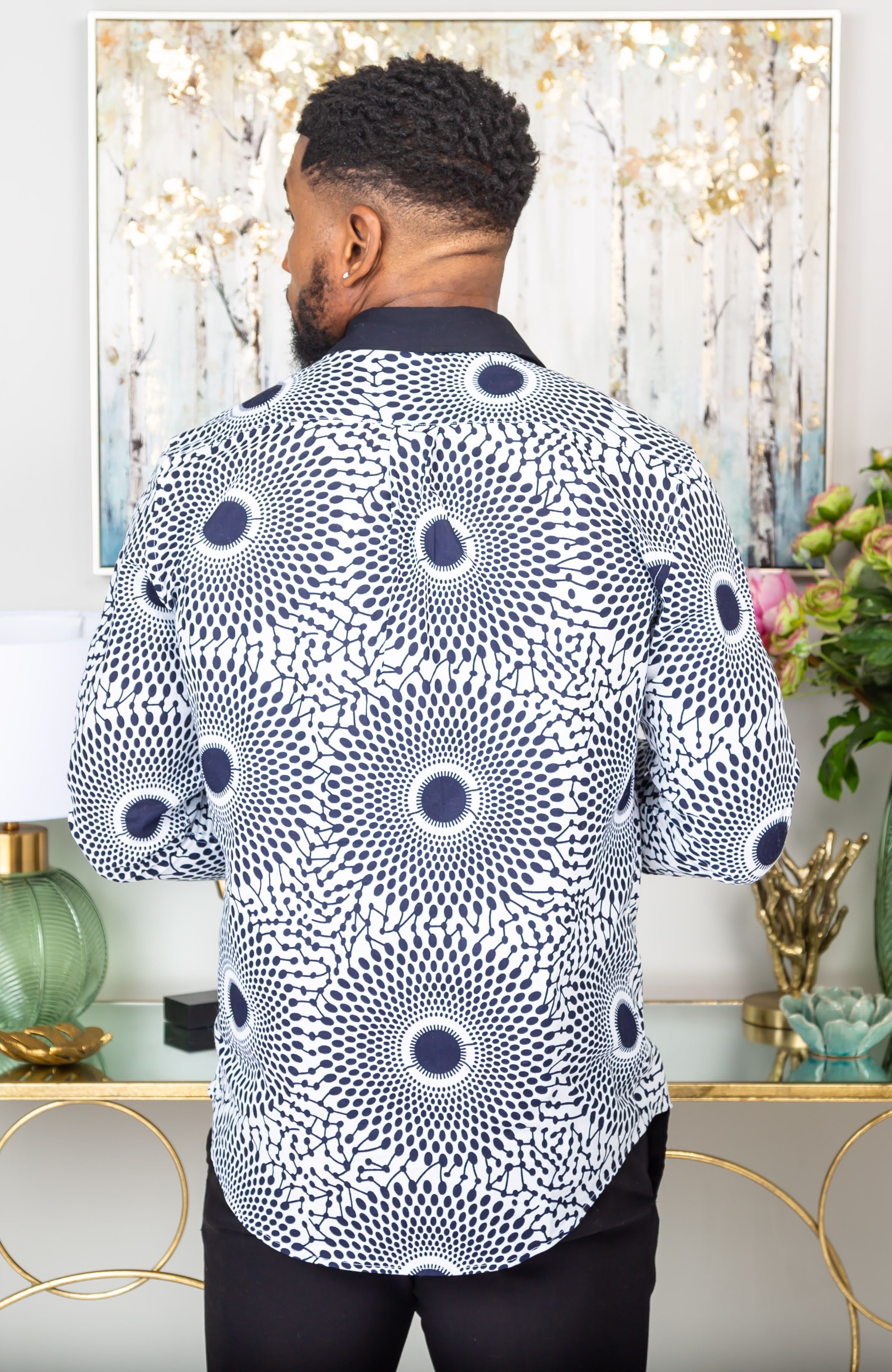 Our Oxford Polo ankara shirt treads the line between smart and casual, making it a great item for in-between days. Wear with jeans or smart trousers or make it suited to business settings with a contrasting jacket.