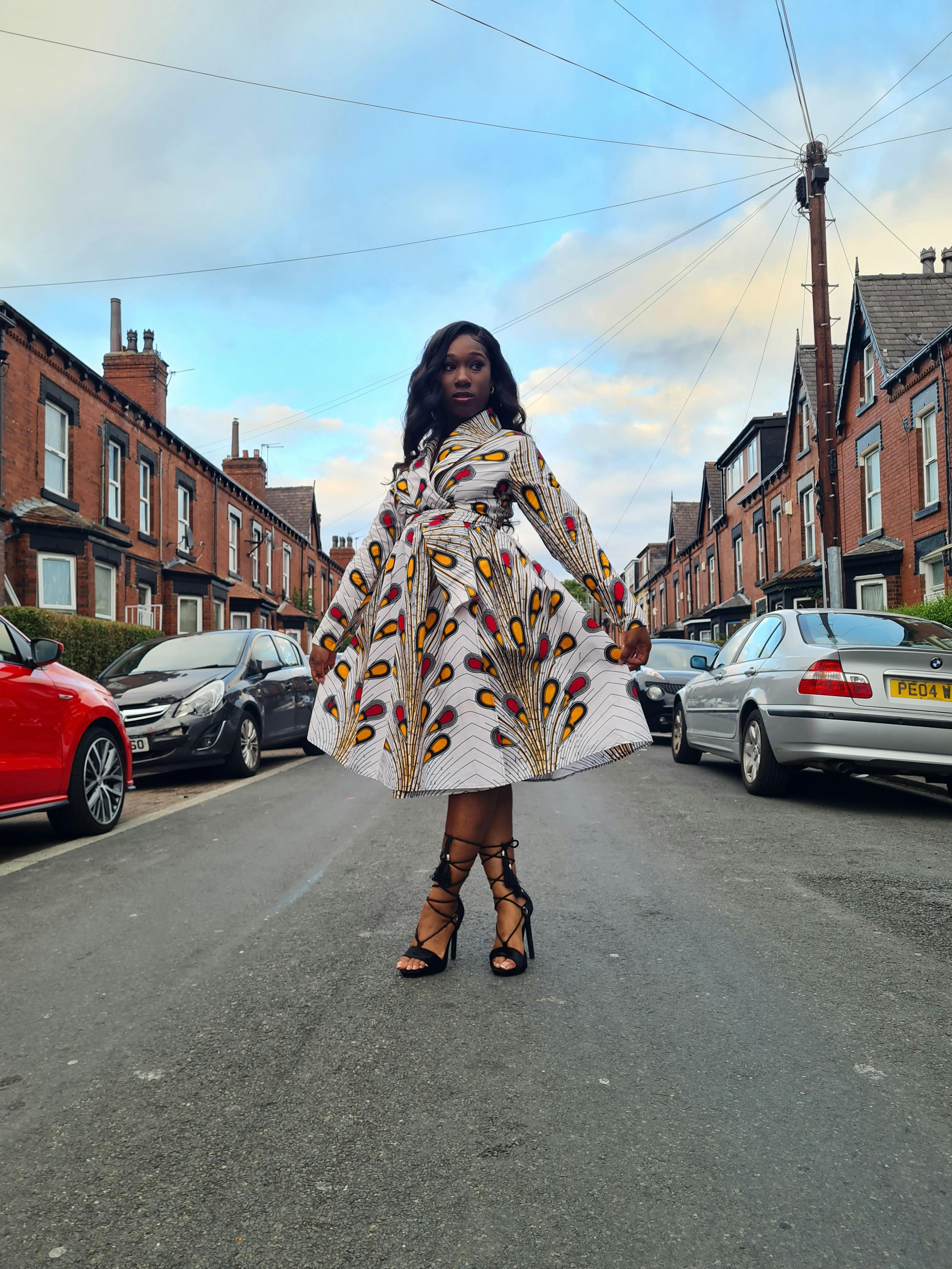 - Mid length dress in a bold African print fabric